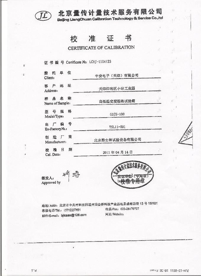 >>高低溫交變濕熱試驗箱校準證書-北京量傳計量-中安電子