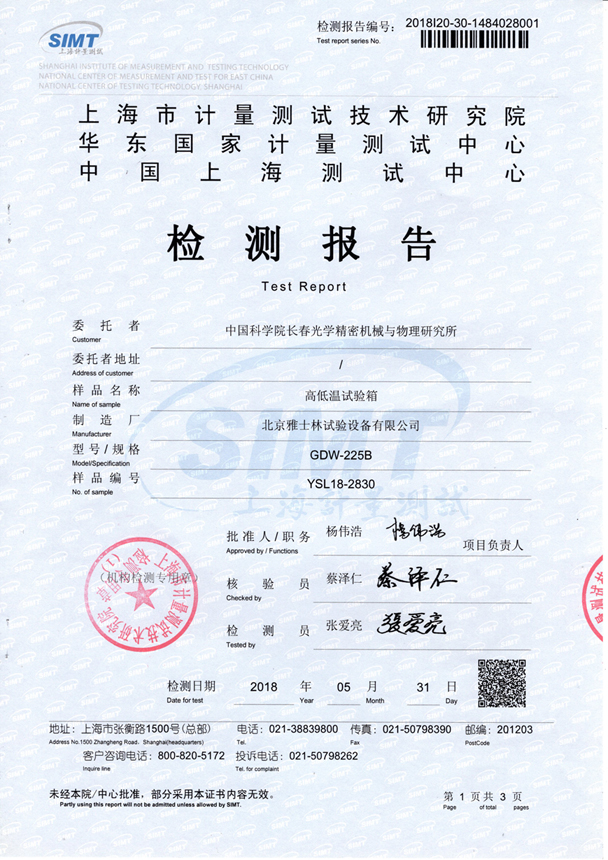 高低溫試驗(yàn)箱在首次投入使用前,應(yīng)對(duì)可反映設(shè)備性能的相關(guān)參數(shù)進(jìn)行詳細(xì)確認(rèn)及測(cè)試,在日常使用中則應(yīng)依據(jù)所使用的試驗(yàn)方法進(jìn)行對(duì)試驗(yàn)參數(shù)的要求,需確認(rèn)其性能是否滿足試驗(yàn)參數(shù)的要求。更多的用戶會(huì)選擇由第三方檢測(cè)機(jī)構(gòu)進(jìn)行檢測(cè),并出廠檢測(cè)報(bào)告,如下: