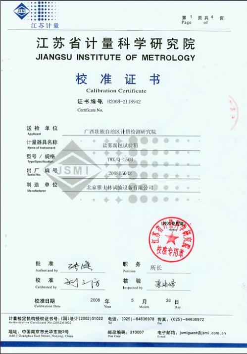鹽霧腐蝕試驗箱校準證書-江蘇計量院-廣西計量院