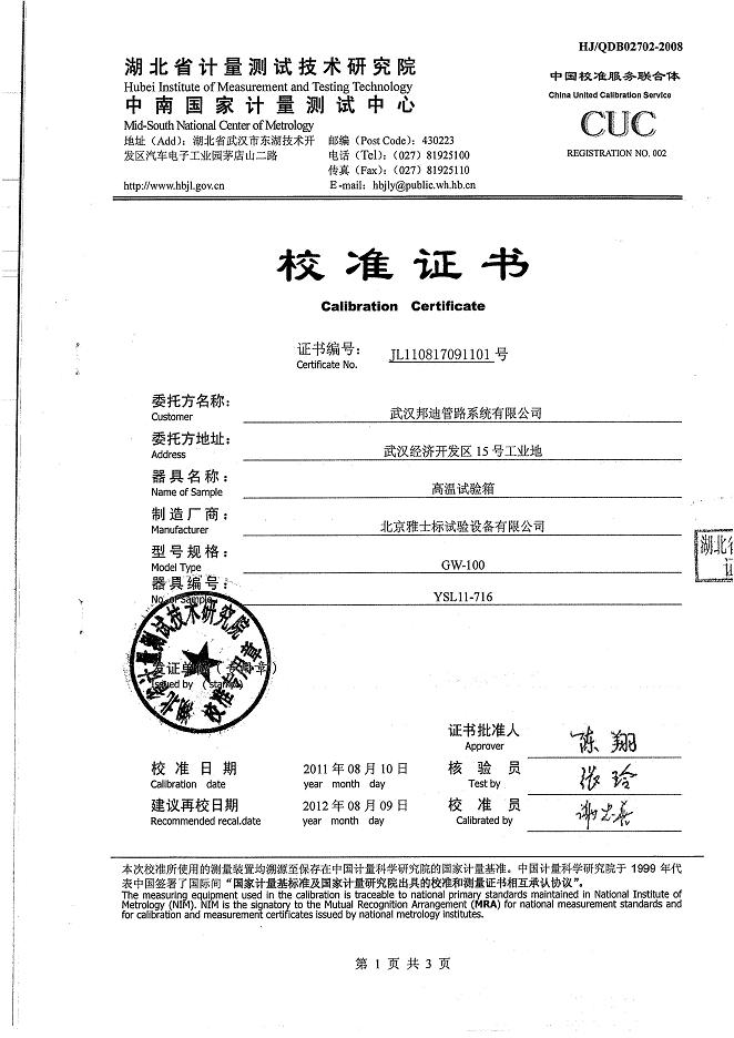 >>高溫試驗箱校準(zhǔn)證書-湖北計量院-邦迪集團