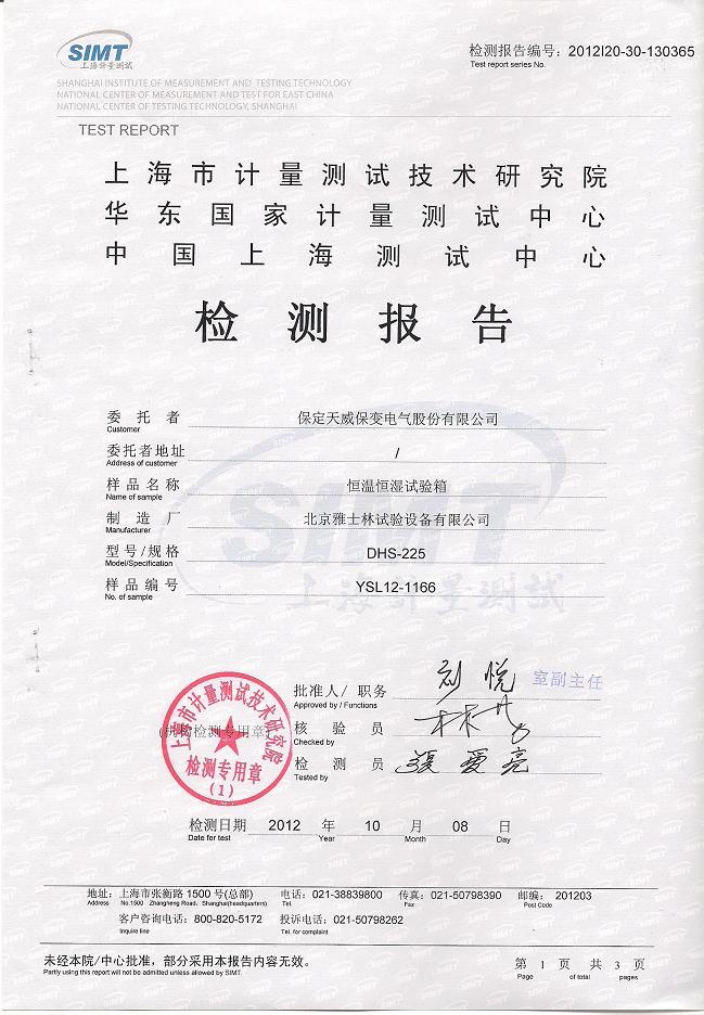 >>恒溫恒濕試驗箱檢測報告-上海計量院-天威保變