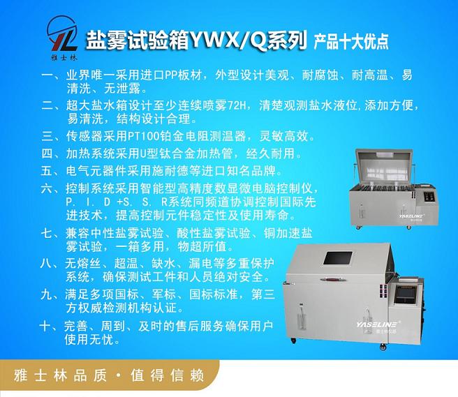 鹽霧腐蝕試驗(yàn)箱為人工氣候環(huán)境“三防”(濕熱、鹽霧、霉菌)試驗(yàn)設(shè)備之一,是模擬大氣中含鹽微小液滴所構(gòu)成的彌散系統(tǒng)的設(shè)備。廣泛應(yīng)用在電子、電工及汽車、摩托車、五金工具、化工等產(chǎn)品及零部件、金屬材料與制品的鍍、涂層等進(jìn)行鹽霧試驗(yàn)。市場規(guī)模巨大,競爭空前,雅士林YASELINE系列鹽霧試驗(yàn)箱高起點(diǎn)、高質(zhì)量、高服務(wù),定位于中高端客戶群體,以其過硬的質(zhì)量和完善的售后服務(wù)及良好的市場口碑贏得了中國航天、中國科學(xué)院、清華大學(xué)、北航、摩托羅拉、ABB、西門子、豐田汽車、中國船舶、北京現(xiàn)代汽車等一系列高端客戶群,其產(chǎn)品具有如下十大優(yōu)點(diǎn):