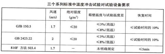下表中列出了三個(gè)系列標(biāo)準(zhǔn)中溫度沖擊試驗(yàn)對(duì)試驗(yàn)箱的要求,由于都是屬于溫度試驗(yàn)的范疇,因此其對(duì)溫度沖擊試驗(yàn)箱的要求與溫度試驗(yàn)箱的要求類似,其主要區(qū)別是增加了溫度沖擊試驗(yàn)中開箱放入試驗(yàn)樣品后試驗(yàn)箱內(nèi)空氣溫度恢復(fù)到規(guī)定試驗(yàn)溫度的時(shí)間要求。